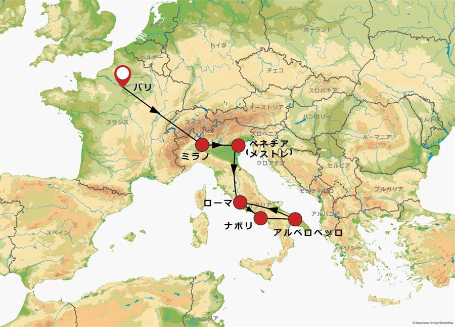 ※アマルフィ海岸ではバスの車両規制に伴い、移動時のみバス2台に分乗する場合があります。またアマルフィドライブは現地事情により行程変更や、観光箇所が割愛となる場合がございます。