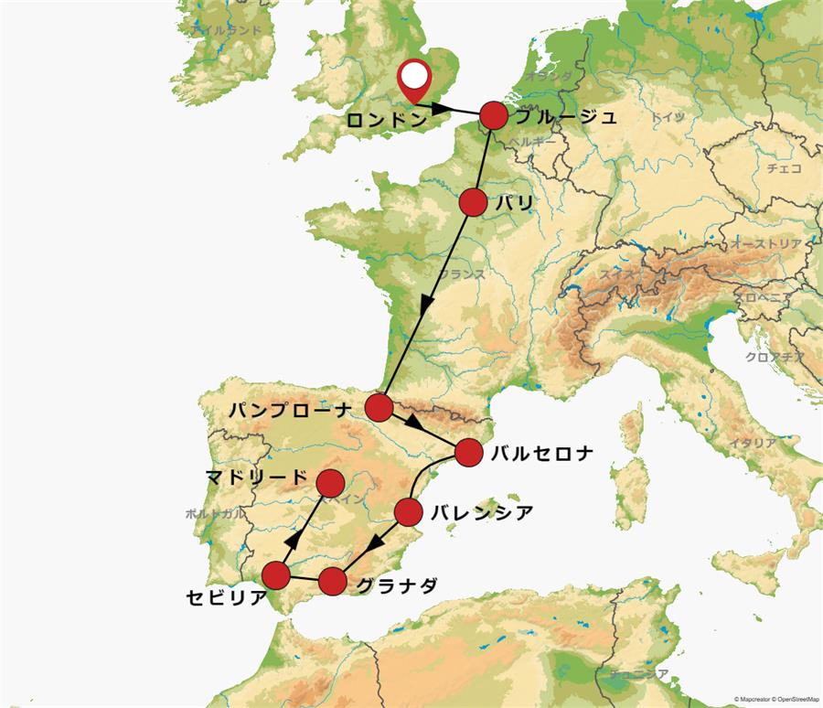 ※アルハンブラ宮殿観光は、アルハンブラ宮殿を望むサンニコラス展望台(下車)とヘネラリーフェ庭園観光(入場)またはアルハンブラ宮殿とヘネラリーフェ庭園(いずれも入場)にご案内します。見学日の14日前までにどちらの観光になるかをお知らせします。ご指定いただくことはできません。
