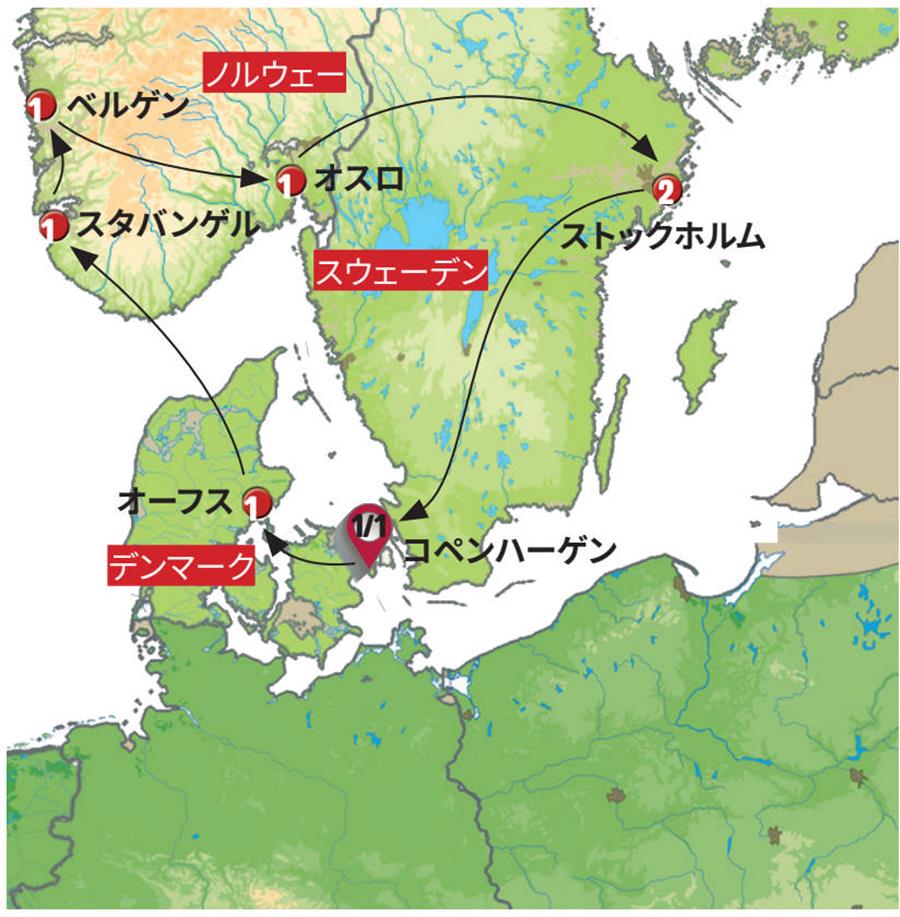 デンマークからノルウェーに渡ります。天候が良ければ船のデッキからの景色をお楽しみいただけます。